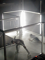 おおよそ2時間にわたるパフォーマンスは拍手喝采にて終演。その後には、“ボーナストラック”と称した実験が行われた。それぞれの映像や音、色、動きに、「水の中」「蚊がいっぱいいる」「天井が下がってくる」「フリーズする」「青い人のコピーをする」「ジグザグに歩く」といった、表現するルールを決め、それぞれの指示のもとで、次にやることを決めていく、という“プログラム”であることが解説された。クロス状に設置されたフレームは、4カ所の入り口と4カ所の出口を持つ「装置(マシン)」なのである。