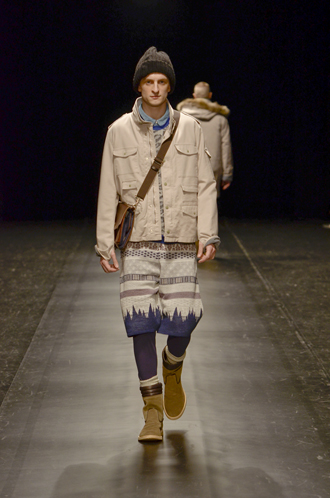 テーマは、「here and there」。今いる場所から自分の行きたい未来への移動がテーマだ。ジプシーやノマドをモチーフに、ニットなどクラシカルな素材とメッシュなど機能的な素材を合わせたスタイル。そして、移動を考え、腰回りなどに付けられたボール型のポーチなどのパーツは取り外しができるようにした。伝統的なジプシーのスタイルと、ノマドワーカーに代表されるような現代の「移動」のスタイルとを融合させたコレクションだという。