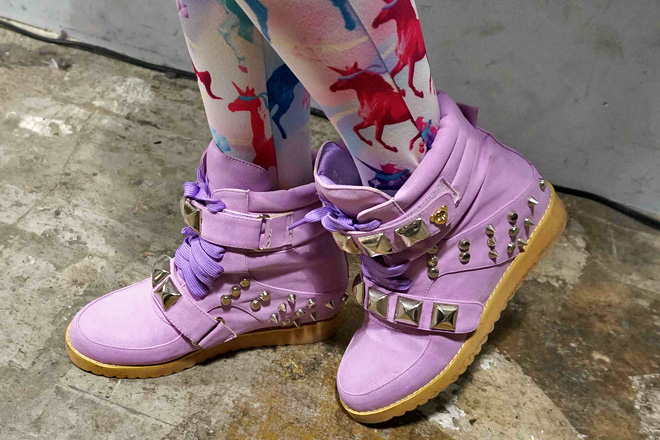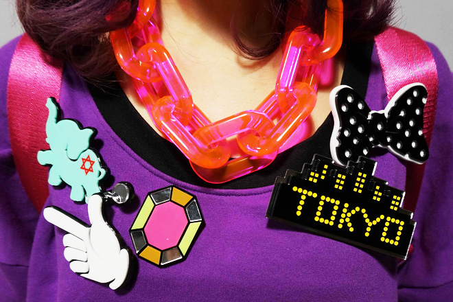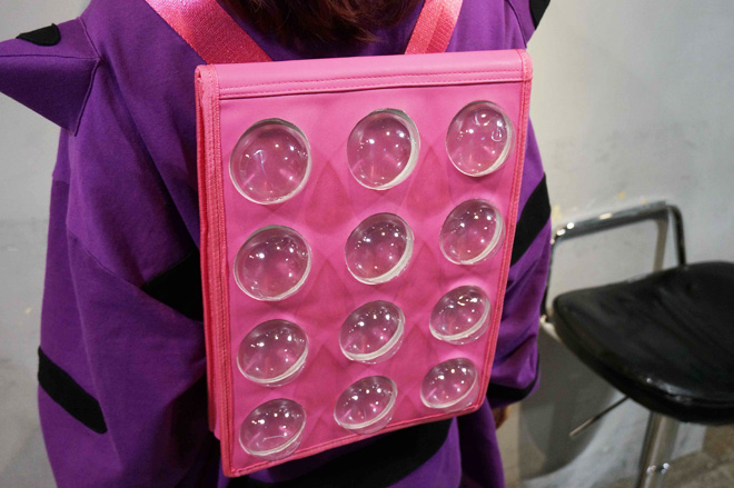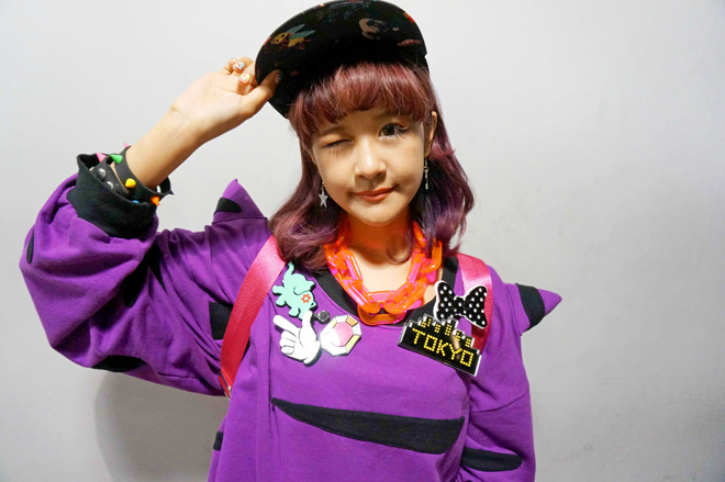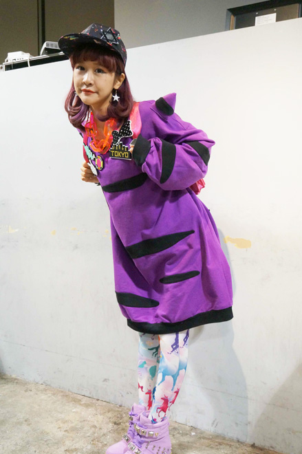 紫色のトップス(Daniel Palillo)と髪の毛の色と合わせてスタイリングしました。いま、台湾では紫色の髪色が大人気なんです。DORAMIKのストッキングは大好きなユニコーンの柄が入ってるので気に入ってます。リュックはgalaxxxyのもの。ランドセルのような形をしていますが、この透明のボールの中には物を入れられるんですよ。