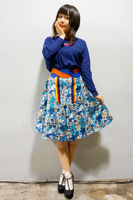 17歳からお世話になっているスタイリストの中村実樹さんにオリジナルでつくってもらったスカートを中心に、足もとにproef(プロエフ)のソックスを合わせて「柄×柄」でまとめました。