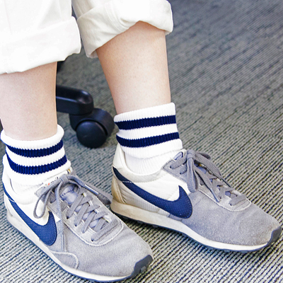 足元だと、ライン入りとかのスポーティーな感じで、スニーカーを目立たせるような色や丈のソックスですね。長めよりも短い丈がより今年っぽいと思います。この春は基本白ベースのソックスを揃えたいです。