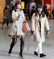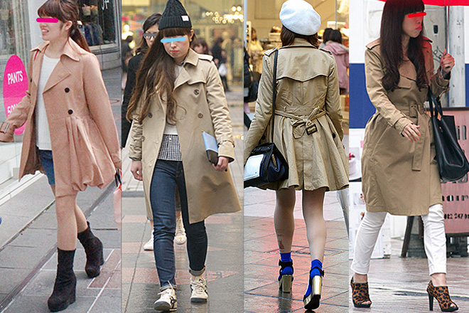 まず、マストレンドとなっていた「女性ベージュ系アウターうちヒザ上丈」は、トレンチコートを中心に、テーラードジャケットやミリタリー風アウター、ショップコートなど様々。デザインというよりは、トレンドに大きく左右されない定番であるベージュという色に惹かれて着用していると思われ、実に10代〜60代と幅広い年代に着用されていた。着用率(通行人に占める割合)は22.6%(女性1,678人中380人)。2人ともベージュのアウターを着用しているケースも少なくなく、まるでコピペかと思うほどトレンチスタイルが街に溢れていた。