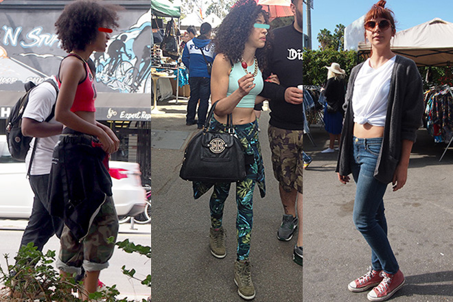 最も多かったのは、ルーズフィットでへそ丈のTシャツに、カットオフのデニムショートパンツやスキニーデニムを合わせた、シンプルな「LAカジュアルスタイル」。