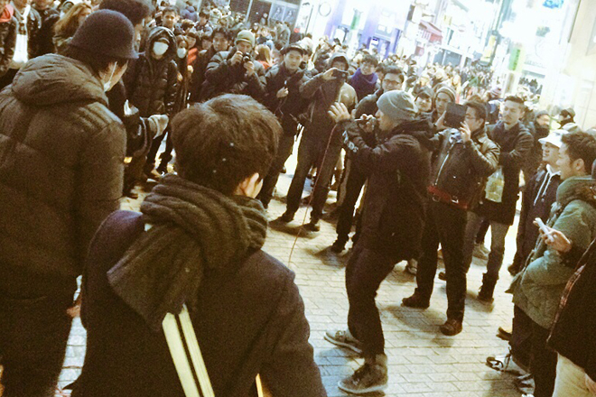 TSUTAYA前での渋谷サイファーの様子。待ち合わせの人や通りすがりの人が多い場所だが、思わず足を止めて聴き入る人がたくさんいる(写真:ACEさん提供)。