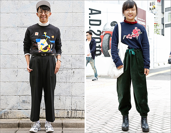 先月(2018年10月)インタビューさせていただいた方のなかから、2名をピックアップ。トップスをインしていた左の女性は、オーストラリアからの観光客。レイヤードしたロングスリーブトップスをインして、ノーアウター。右は薄手のニットをデザインパンツにオンして、80sの定点観測で取り上げた「ズタ袋わしづかみ」さながらのモードな着こなしが印象的だった。